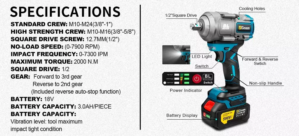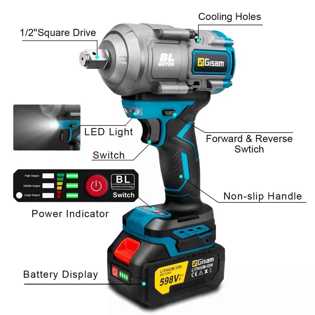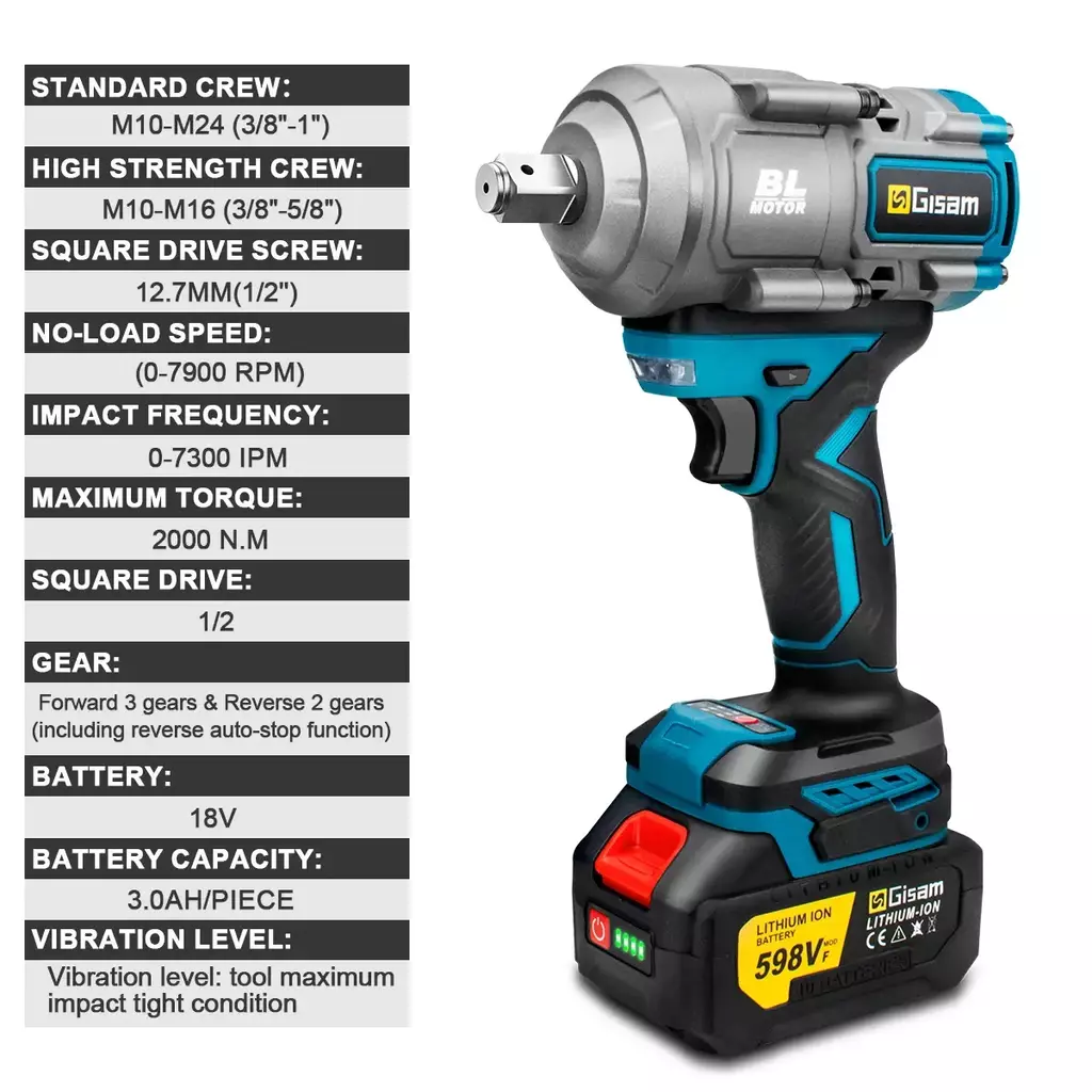 Seja você um entusiasta do bricolage, um profissional da área automotiva ou alguém em busca de uma ferramenta confiável e potente, a Chave de Impacto Elétrica Gisam 2000N.M Torque Brushless é a escolha perfeita para você! Com um design ergonômico e inovador, esta ferramenta é uma verdadeira revolução quando se trata de praticidade e desempenho.