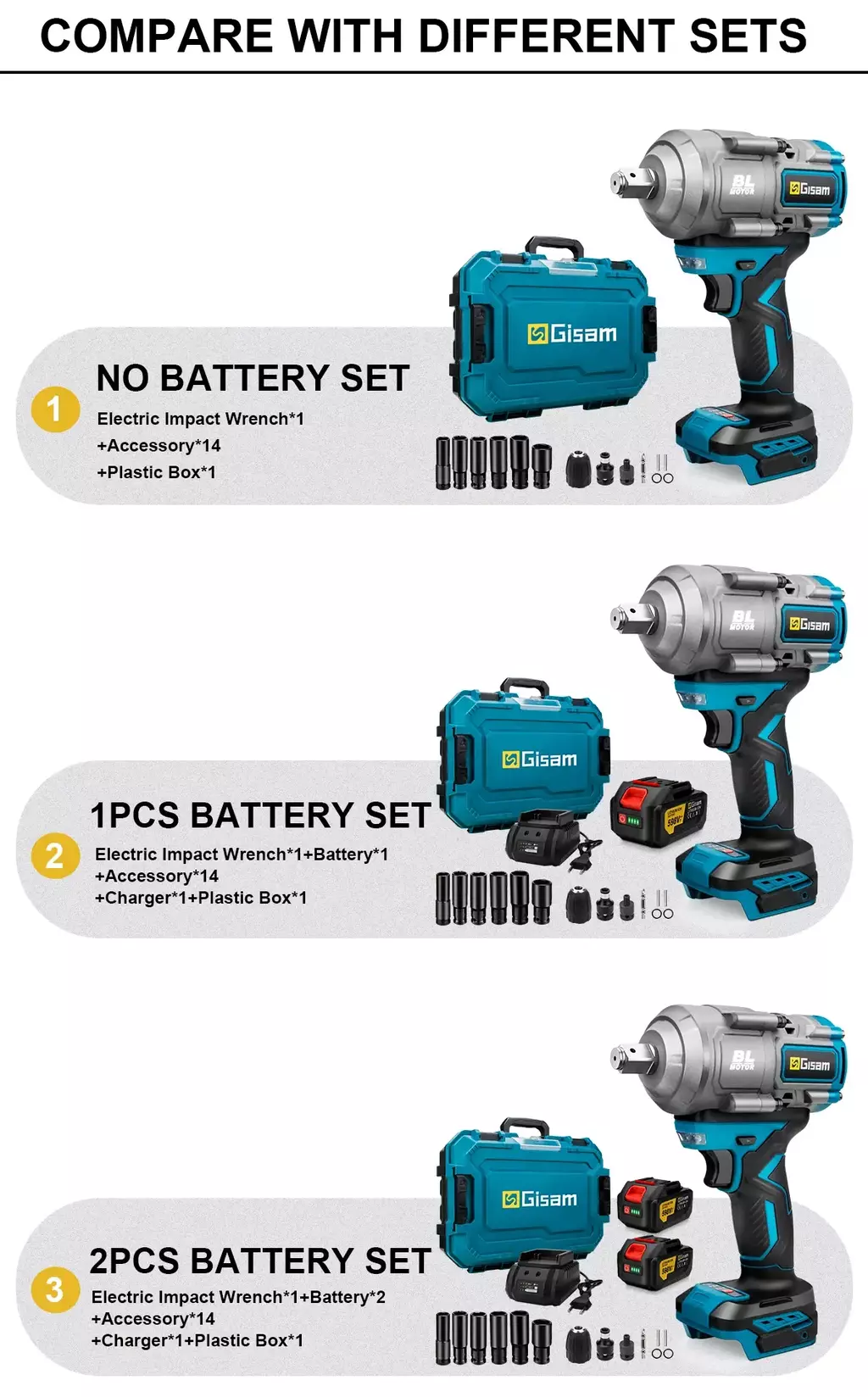 Para atender às suas preferências e necessidades individuais, a Chave de Impacto Gisam está disponível em diferentes opções, incluindo a versão com 1 bateria para conveniência sem fio, a opção sem bateria e sem plugue para quem já possui acessórios compatíveis, e a versão com 2 baterias para garantir que você nunca fique sem energia durante o seu trabalho.